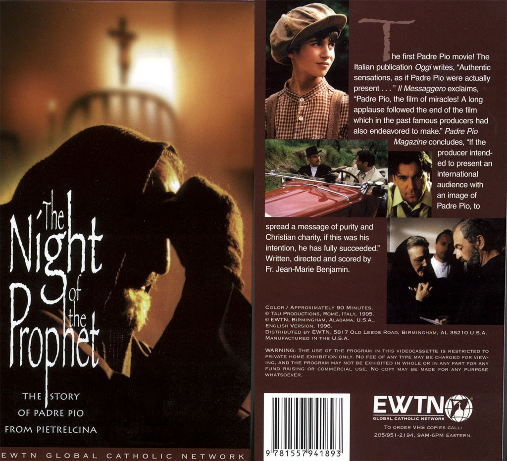 Padre Pio: The night of the prophet Written and directed by: Jean-Marie Benjamin With Written and produced by Jean-Marie Benjamin, the story of the film takes us back to 1946 through an inquiry made by a Roman journalist. In Paris, in March 1968, after reading a little booklet dedicated to Padre Pio from Pietrelcina, Jean-Marie Benjamin decides to travel to Italy to meet the stigmatized monk. He remains 11 days in San Giovanni Rotondo, succeeded to see Padre Pio and to speak with him. Profoundly touched by the holiness of this man of God, Jean-Marie Benjamin has from 1969 up to now written a book entitled Les Mystères de Padre Pio, published by France Empire (Paris 1969) and Epistolario di Padre Pio in audio cassettes, published by San Paolo Editions (Rome 1992), further written, directed and produced the first film entitled Padre Pio The Night of the Prophet (broadcast by the Italian Television RAIUNO in April and May 1998) and, with the help of the countess Verena du Pasquier he has built a monument for Padre Pio in Assisi that was inaugurated on 21 September 1997. |